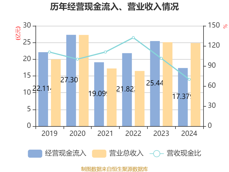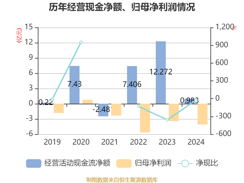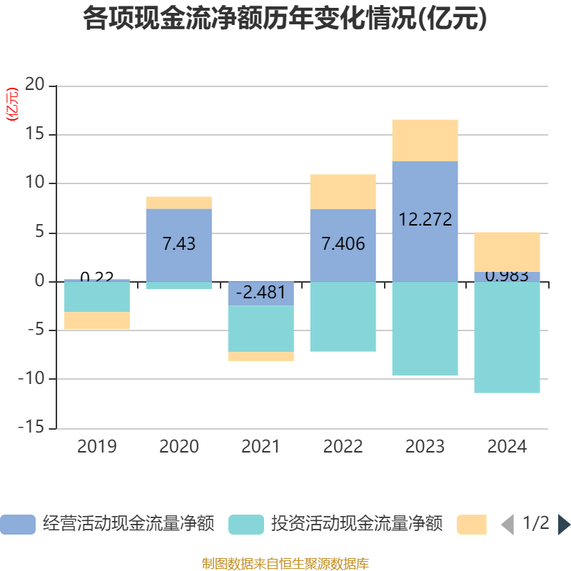 截至2024年,公司经营活动现金流净额为9834.65万元,同比下降91.99%;筹资活动现金流净额4.04亿元,同比减少2110.42万元;投资活动现金流净额-11.4亿元,上年同期为-9.61亿元。