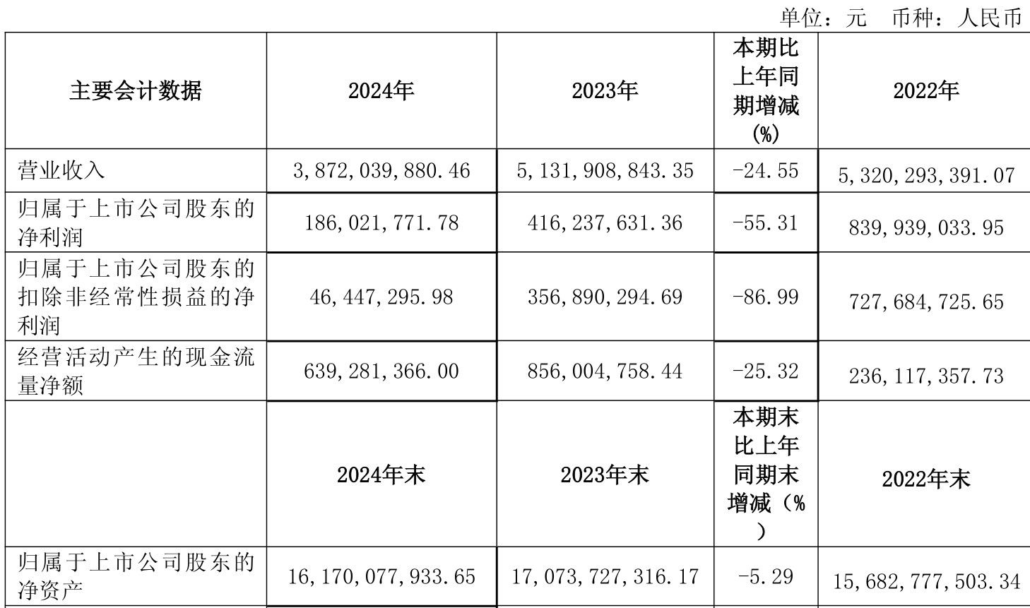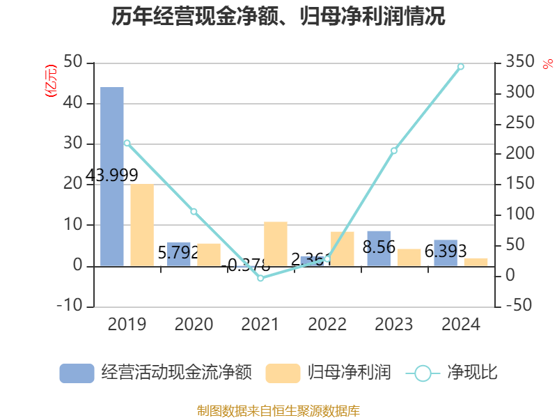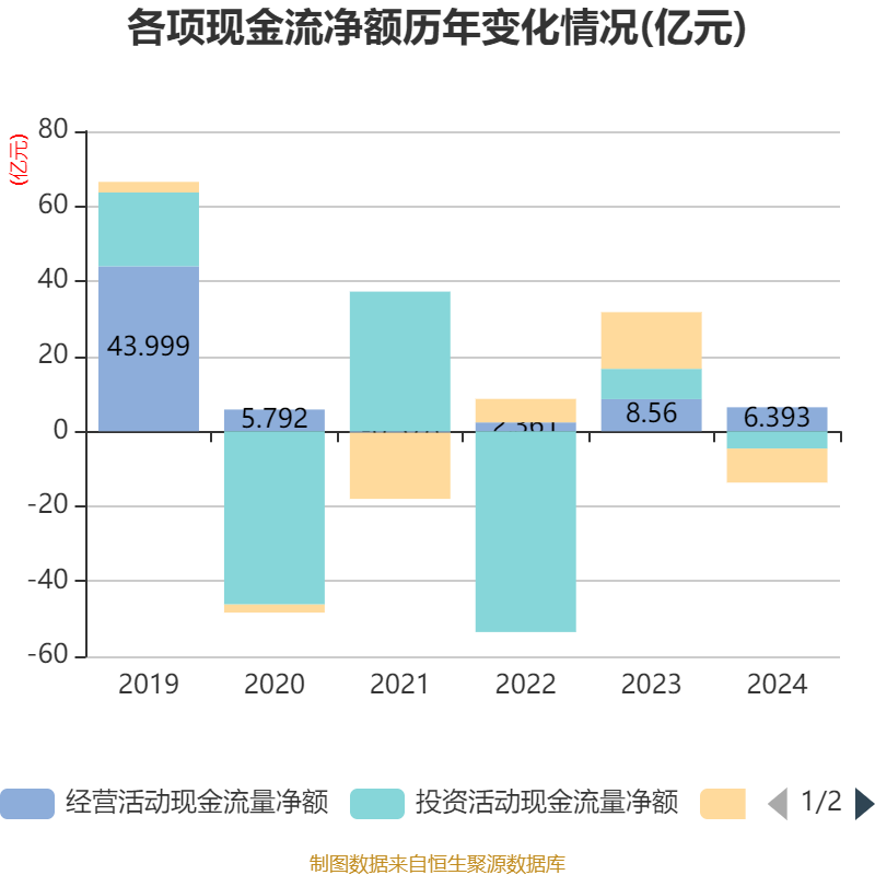截至2024年,公司经营活动现金流净额为6.39亿元,同比下降25.32%;筹资活动现金流净额-9.08亿元,同比减少24.19亿元;投资活动现金流净额-4.61亿元,上年同期为8.09亿元。