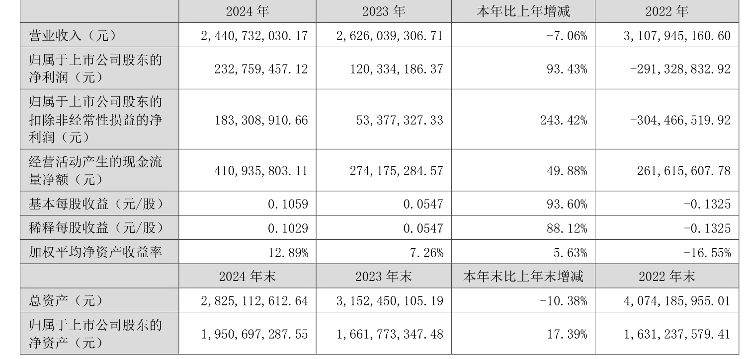 中证智能财讯誉衡药业(002437)4月26日披露2024年年度报告。2024年,公司实现营业总收入24.41亿元,同比下降7.06%;归母净利润2.33亿元,同比增长93.43%;扣非净利润1.83亿元,同比增长243.42%;经营活动产生的现金流量净额为4.11亿元,同比增长49.88%;报告期内,誉衡药业基本每股收益为0.1059元,加权平均净资产收益率为12.89%。