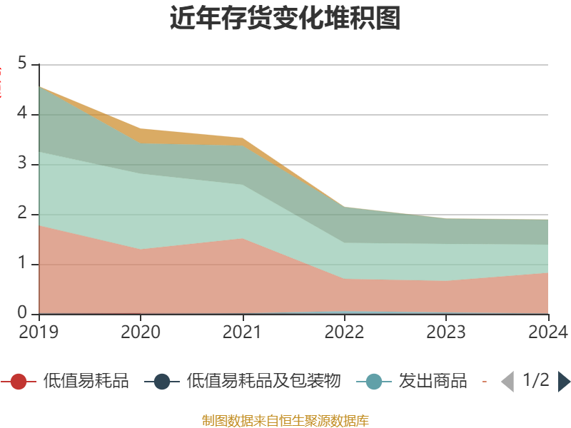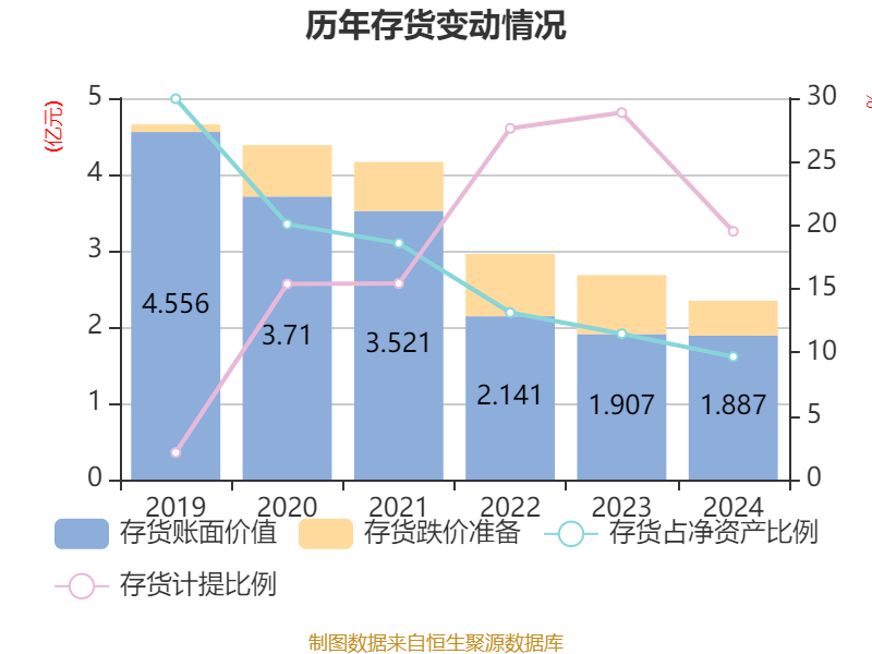 从存货变动来看,截至2024年末,公司存货账面价值为1.89亿元,占净资产的9.67%,较上年末减少199.51万元。其中,存货跌价准备为4577.3万元,计提比例为19.52%。