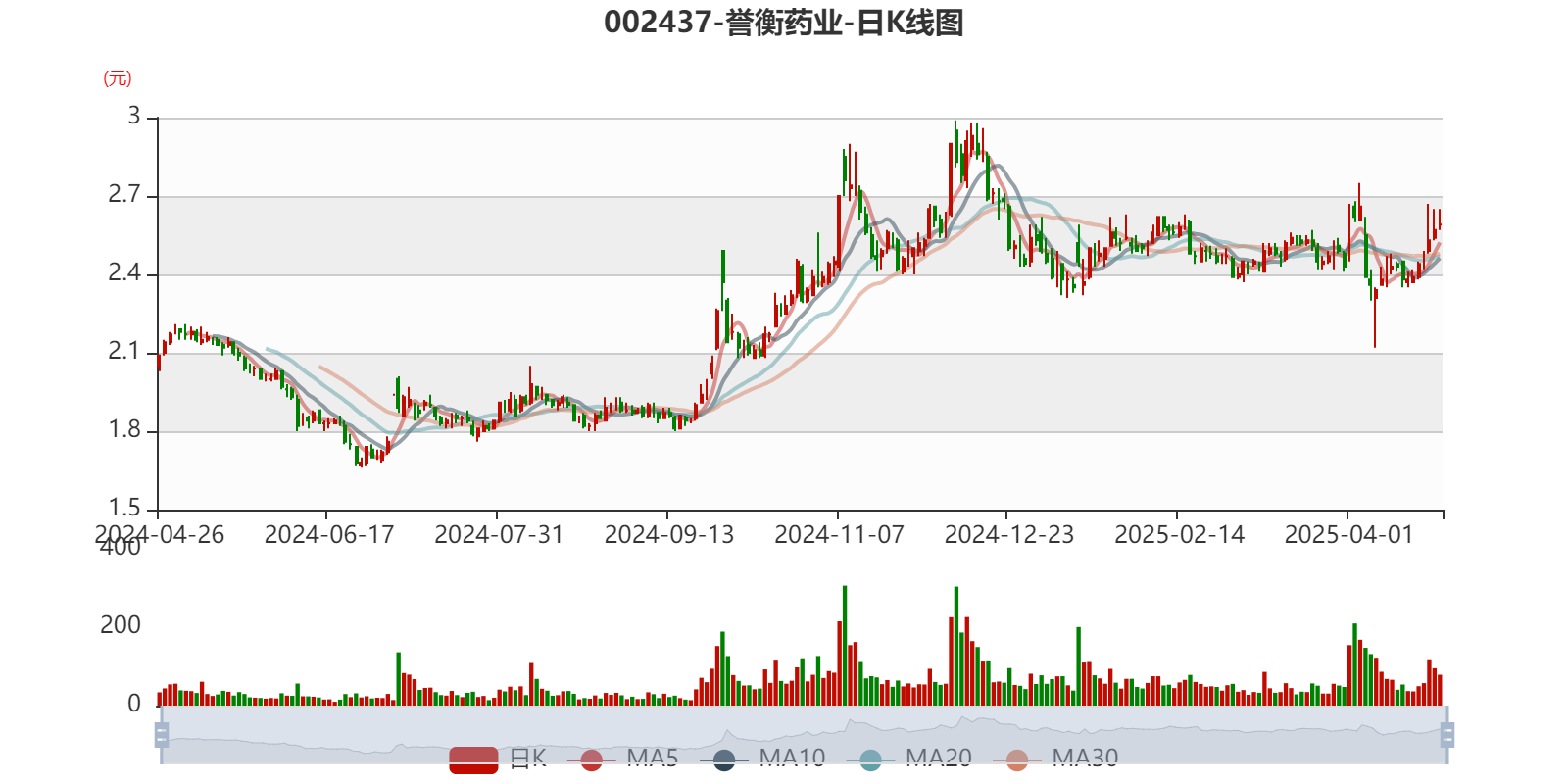 以4月25日收盘价计算,誉衡药业目前市盈率(TTM)约为24.99倍,市净率(LF)约2.98倍,市销率(TTM)约2.38倍。