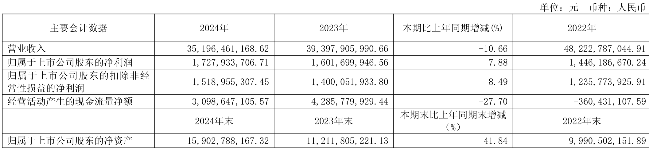 中证智能财讯厦门钨业(600549)4月26日披露2024年年度报告。2024年,公司实现营业总收入351.96亿元,同比下降10.66%;归母净利润17.28亿元,同比增长7.88%;扣非净利润15.19亿元,同比增长8.49%;经营活动产生的现金流量净额为30.99亿元,同比下降27.70%;报告期内,厦门钨业基本每股收益为1.2094元,加权平均净资产收益率为14.36%。公司2024年度分配预案为:拟向全体股东每10股派现4.2元(含税)。