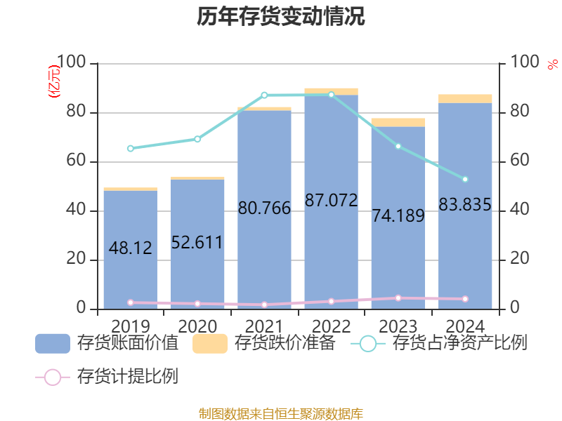 从存货变动来看,截至2024年末,公司存货账面价值为83.83亿元,占净资产的52.72%,较上年末增加9.65亿元。其中,存货跌价准备为3.47亿元,计提比例为3.97%。