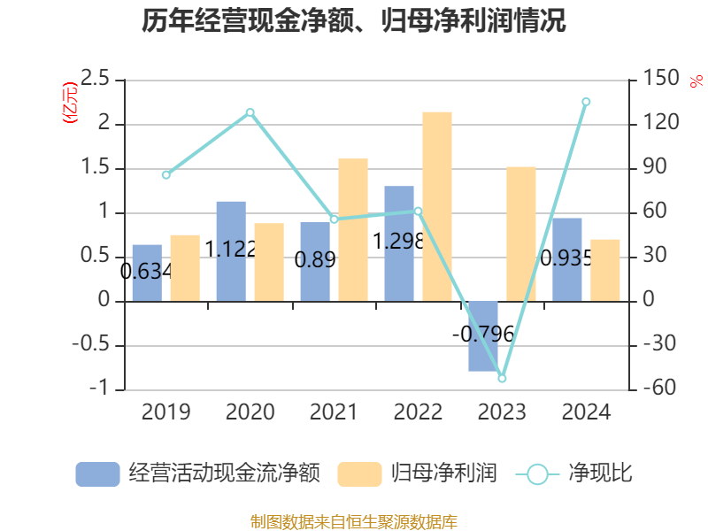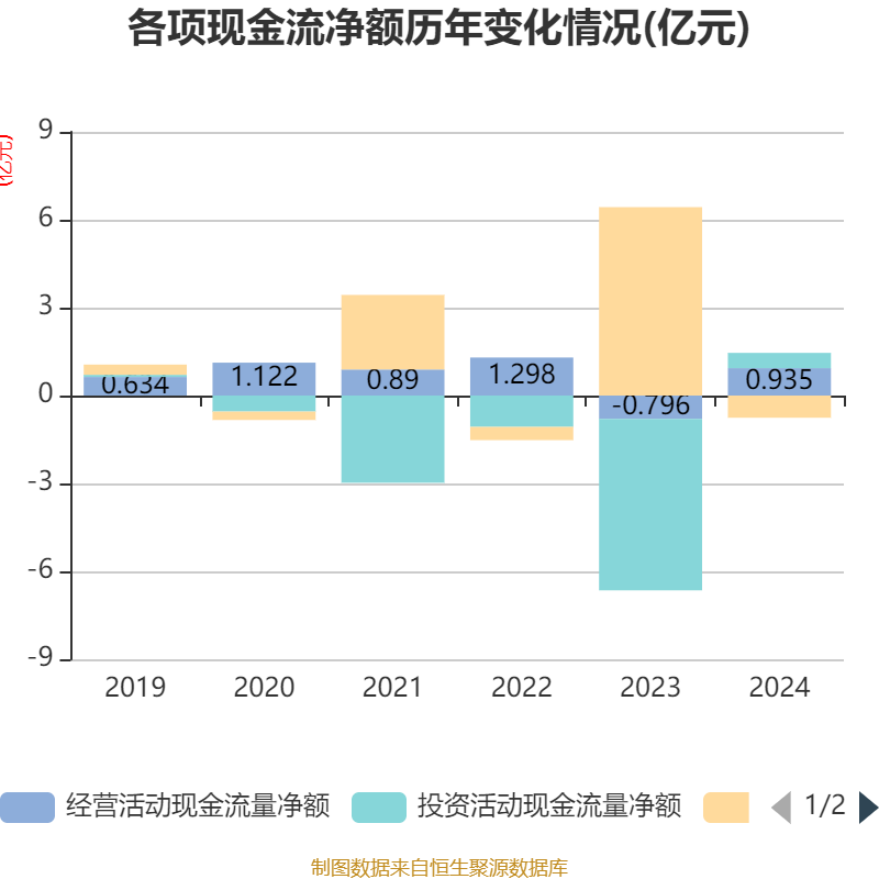 截至2024年,公司经营活动现金流净额为9354.41万元,同比增加1.73亿元;筹资活动现金流净额-7569.5万元,同比减少7.19亿元;投资活动现金流净额5212.53万元,上年同期为-5.85亿元。