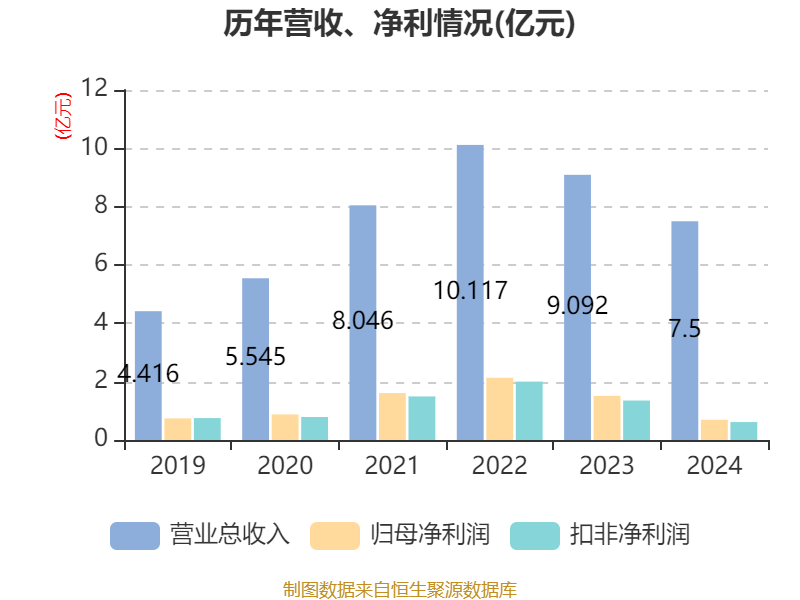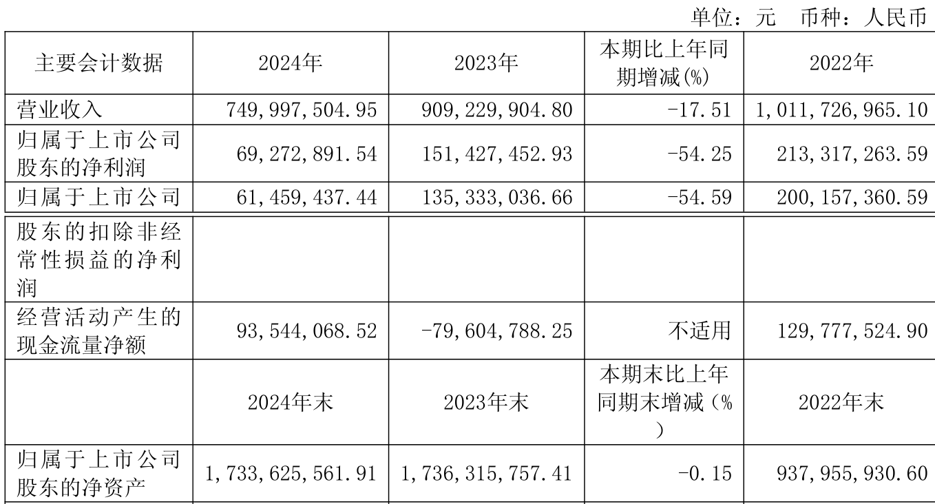 中证智能财讯东威科技(688700)4月26日披露2024年年度报告。2024年,公司实现营业总收入7.5亿元,同比下降17.51%;归母净利润6927.29万元,同比下降54.25%;扣非净利润6145.94万元,同比下降54.59%;经营活动产生的现金流量净额为9354.41万元,上年同期为-7960.48万元;报告期内,东威科技基本每股收益为0.23元,加权平均净资产收益率为4.02%。公司2024年度分配预案为:拟向全体股东每10股派现1元(含税)。