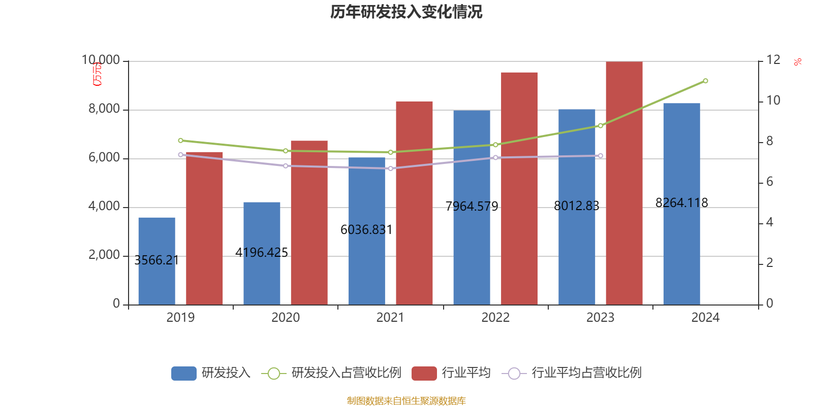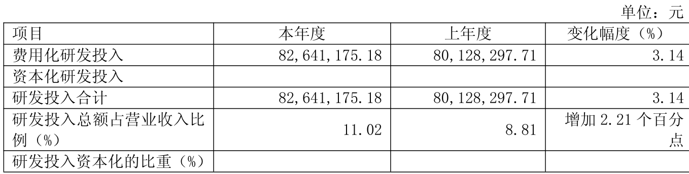 2024年全年,公司研发投入金额为8264.12万元,同比增长3.14%;研发投入占营业收入比例为11.02%,相比上年同期上升2.21个百分点。