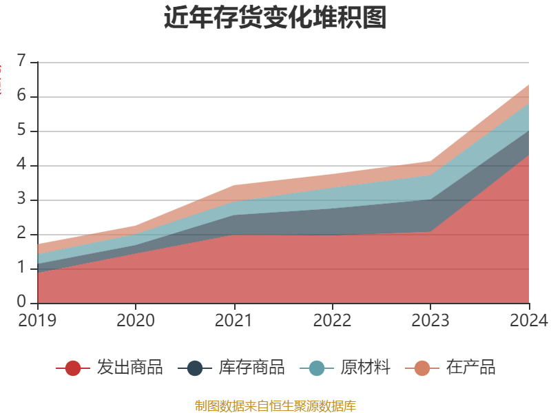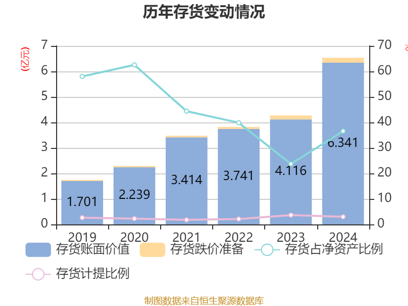 从存货变动来看,截至2024年末,公司存货账面价值为6.34亿元,占净资产的36.58%,较上年末增加2.23亿元。其中,存货跌价准备为1944.47万元,计提比例为2.98%。