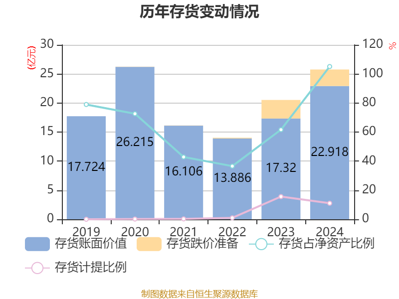 从存货变动来看,截至2024年末,公司存货账面价值为22.92亿元,占净资产的105.08%,较上年末增加5.6亿元。其中,存货跌价准备为2.84亿元,计提比例为11.03%。