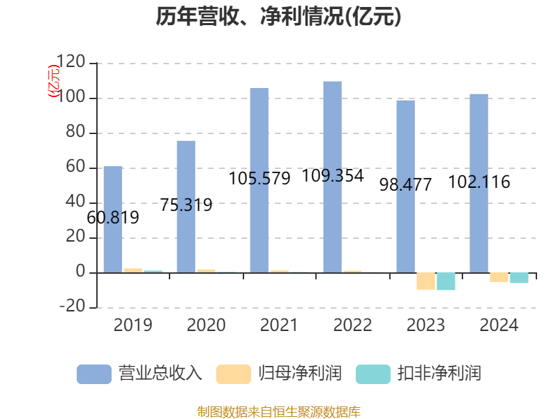 中证智能财讯联创电子(002036)4月26日披露2024年年度报告。2024年,公司实现营业总收入102.12亿元,同比增长3.69%;归母净利润亏损5.53亿元,上年同期亏损9.92亿元;扣非净利润亏损6.1亿元,上年同期亏损10.15亿元;经营活动产生的现金流量净额为3.45亿元,同比增长64.16%;报告期内,联创电子基本每股收益为-0.52元,加权平均净资产收益率为-22.30%。
