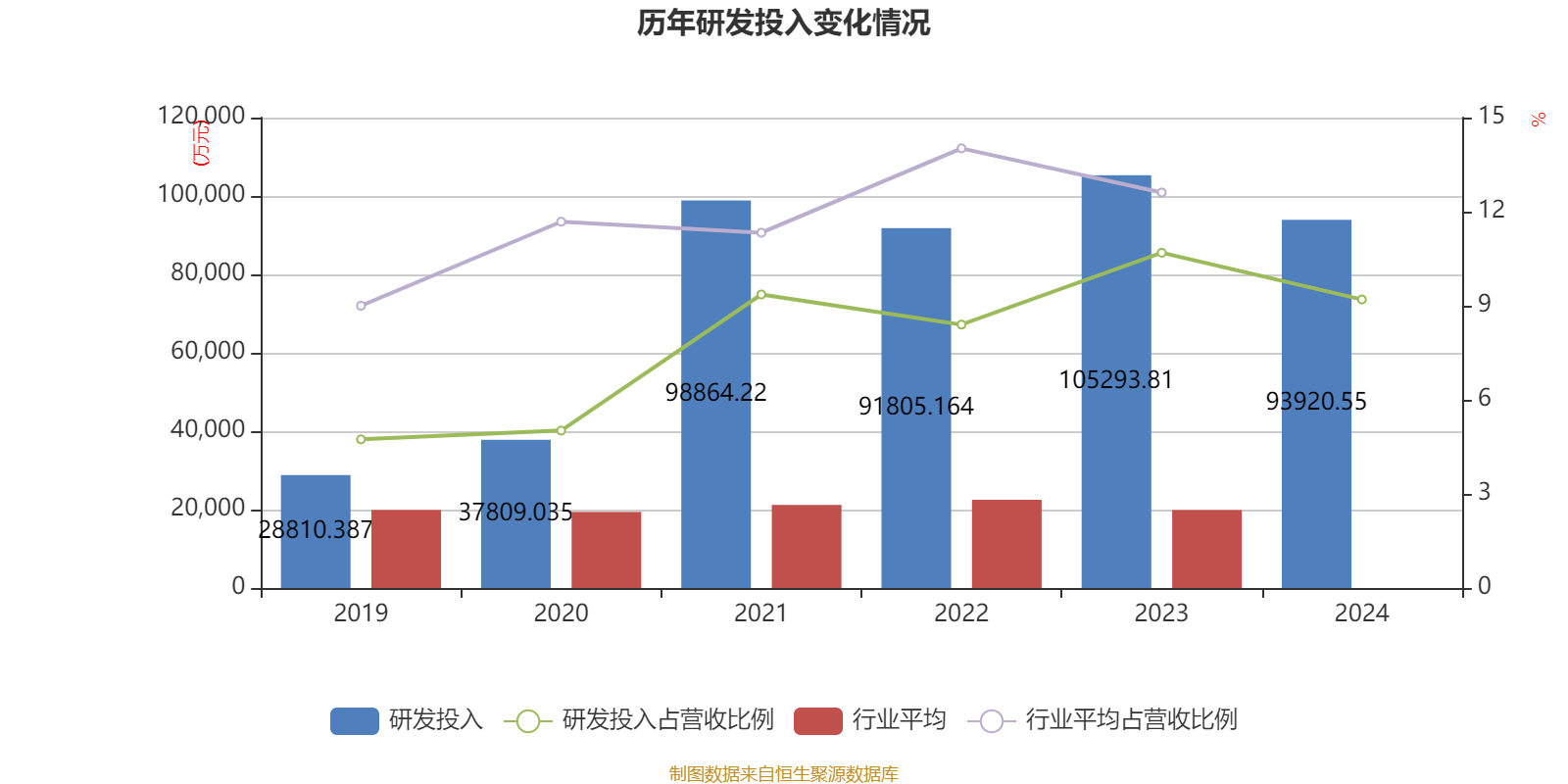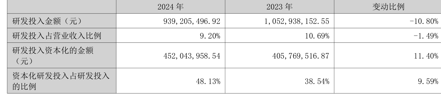 2024年全年,公司研发投入金额为9.39亿元,同比下降10.8%;研发投入占营业收入比例为9.2%,相比上年同期下降1.49个百分点。此外,公司全年研发投入资本化率为48.13%。