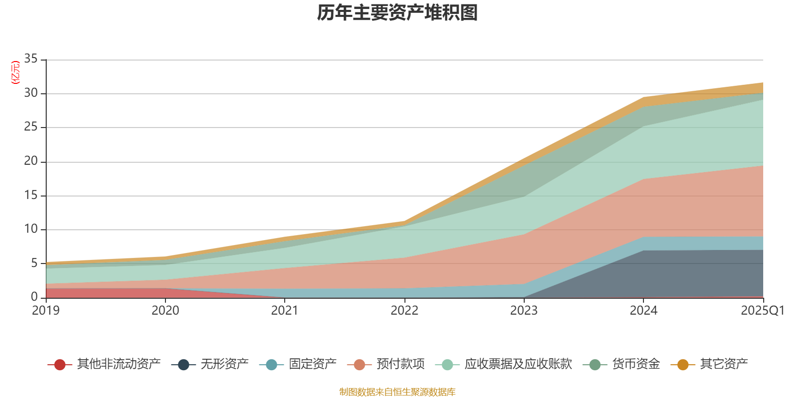 资产重大变化方面,截至2025年一季度末,公司货币资金较上年末减少64.05%,占公司总资产比重下降6.46个百分点;应收票据及应收账款较上年末增加24.84%,占公司总资产比重上升4.3个百分点;预付款项较上年末增加22.47%,占公司总资产比重上升4.08个百分点;无形资产较上年末减少0.62%,占公司总资产比重下降1.72个百分点。