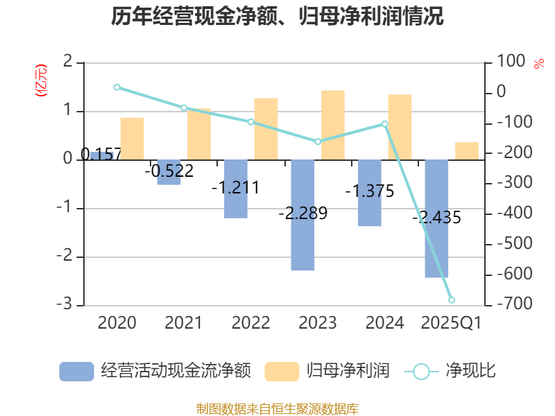截至2025年一季度末,公司经营活动现金流净额为-2.44亿元,同比减少9728.82万元;筹资活动现金流净额7456.15万元,同比减少234.26万元;投资活动现金流净额-1420.05万元,上年同期为-2324.53万元。