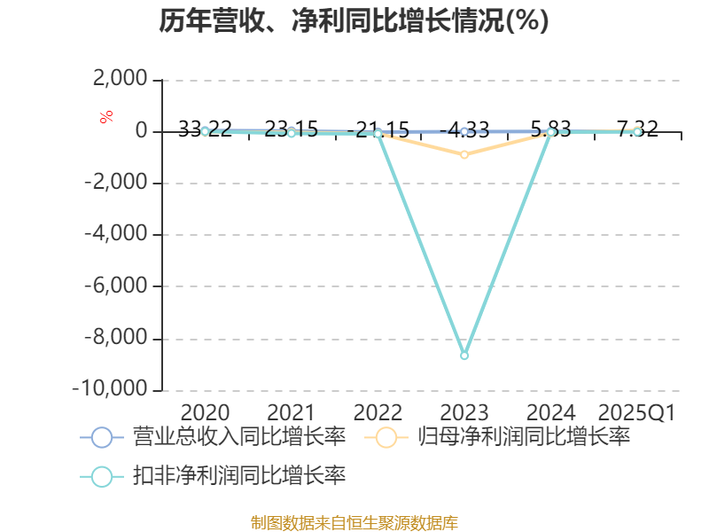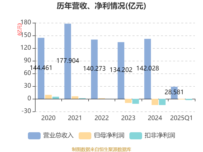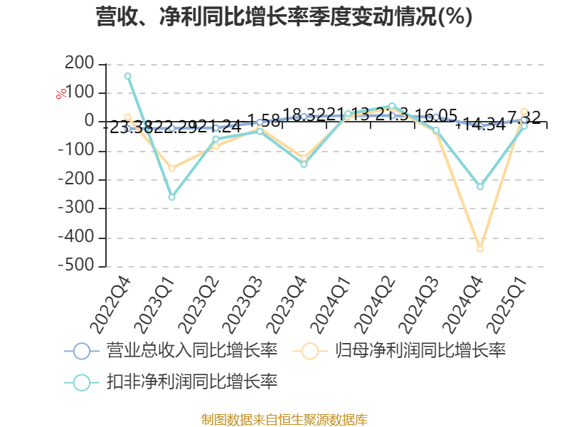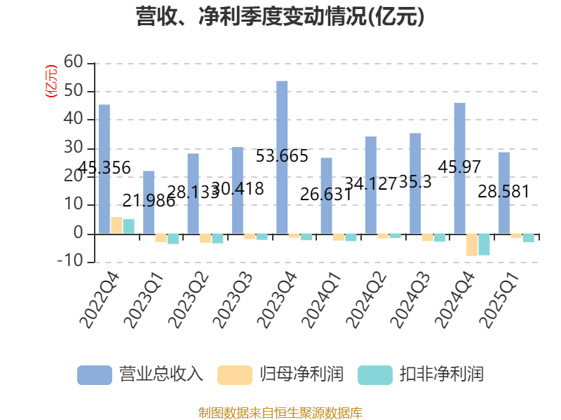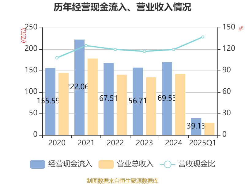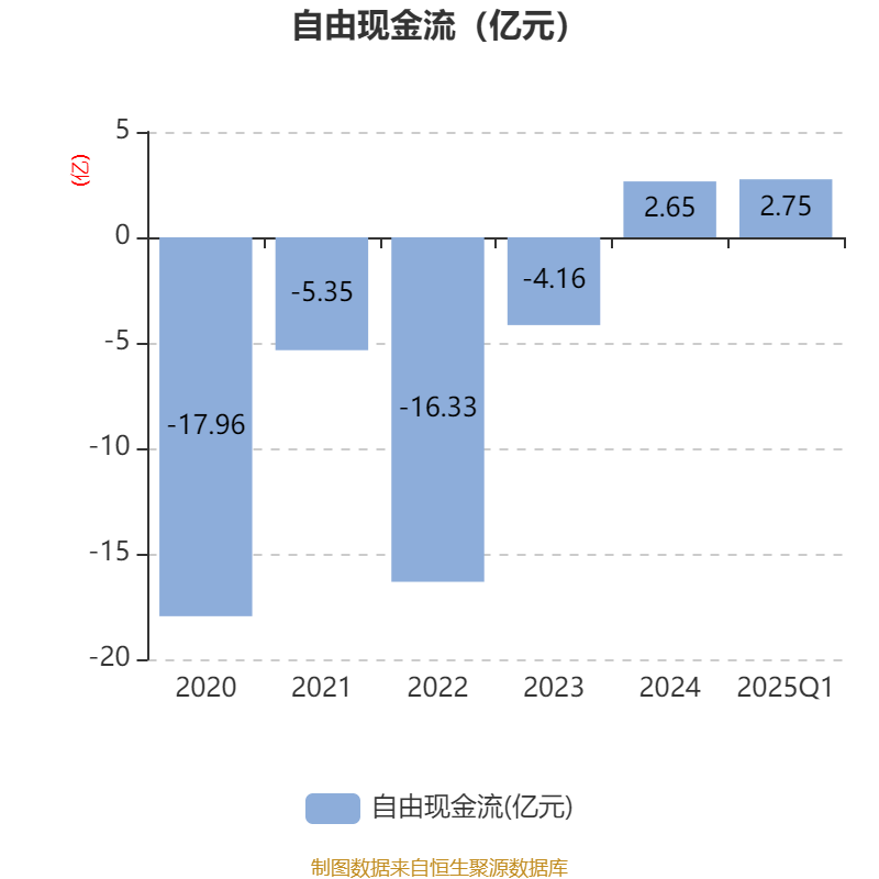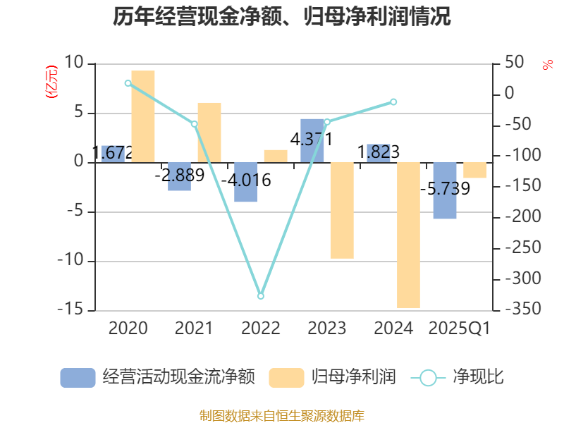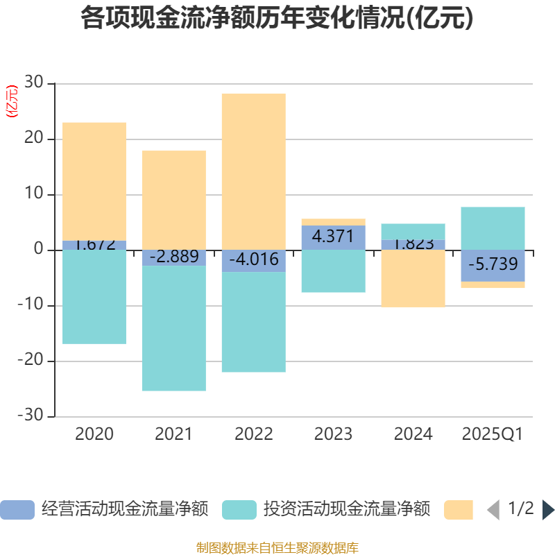 截至2025年一季度末,公司经营活动现金流净额为-5.74亿元,同比增加5.22亿元;筹资活动现金流净额-1.14亿元,同比减少2.07亿元;投资活动现金流净额7.7亿元,上年同期为8.21亿元。