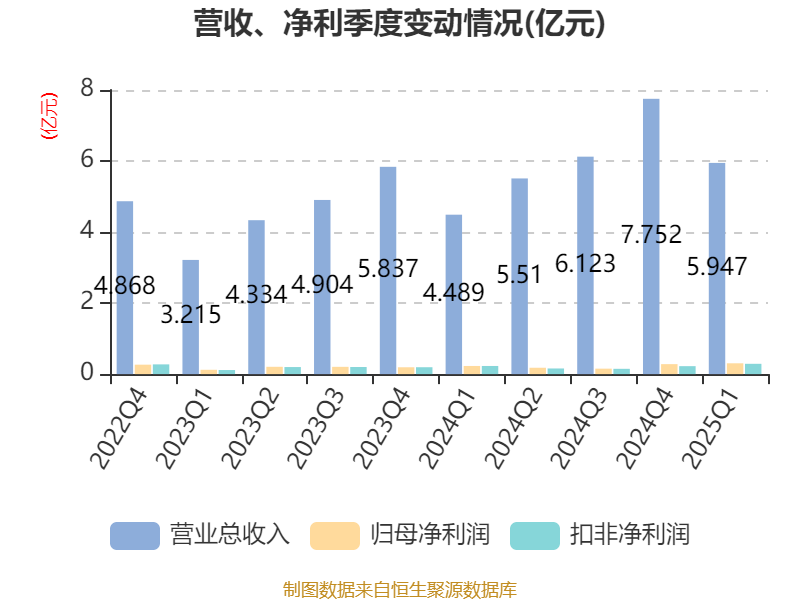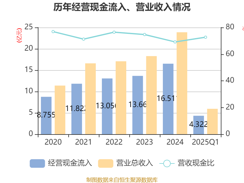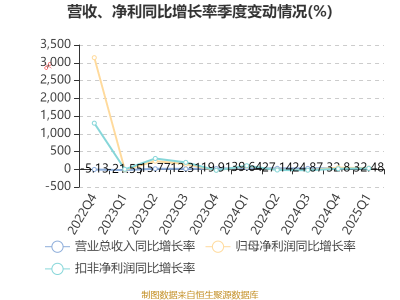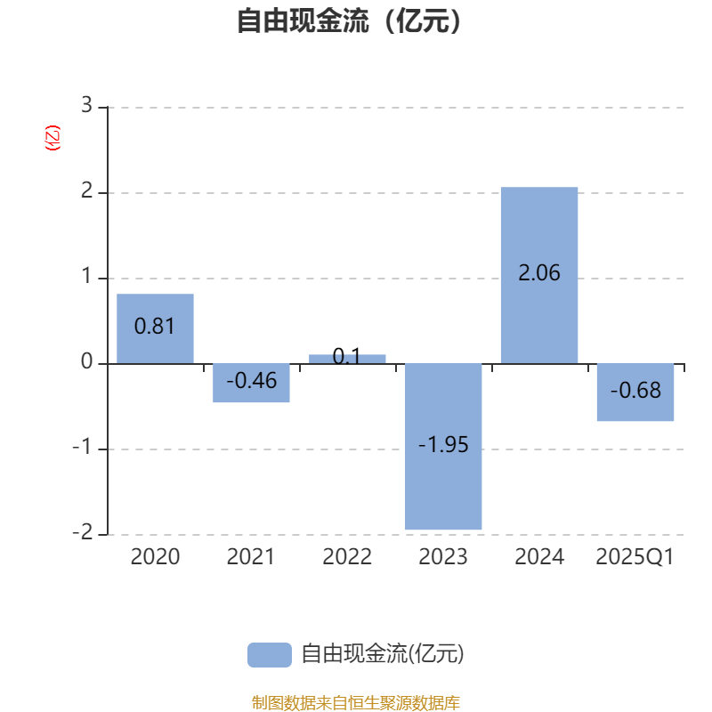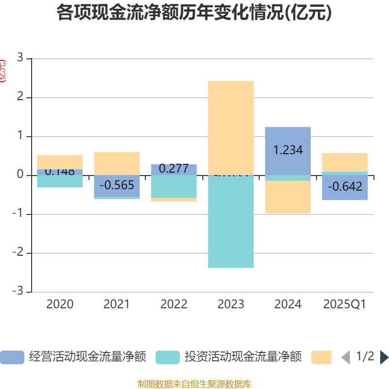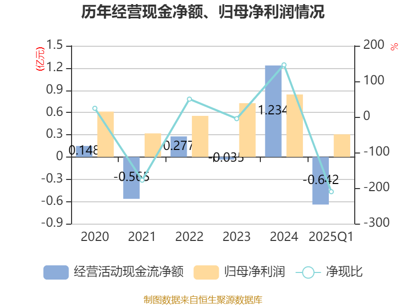 截至2025年一季度末,公司经营活动现金流净额为-6416.47万元,同比减少9884.18万元;筹资活动现金流净额4704.85万元,同比增加6557.31万元;投资活动现金流净额949.91万元,上年同期为-1533.25万元。