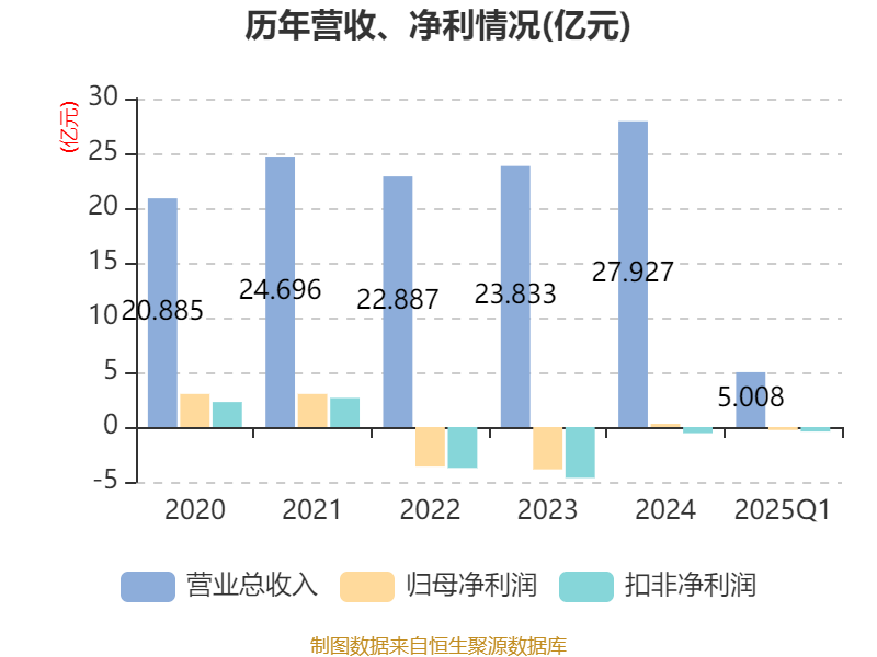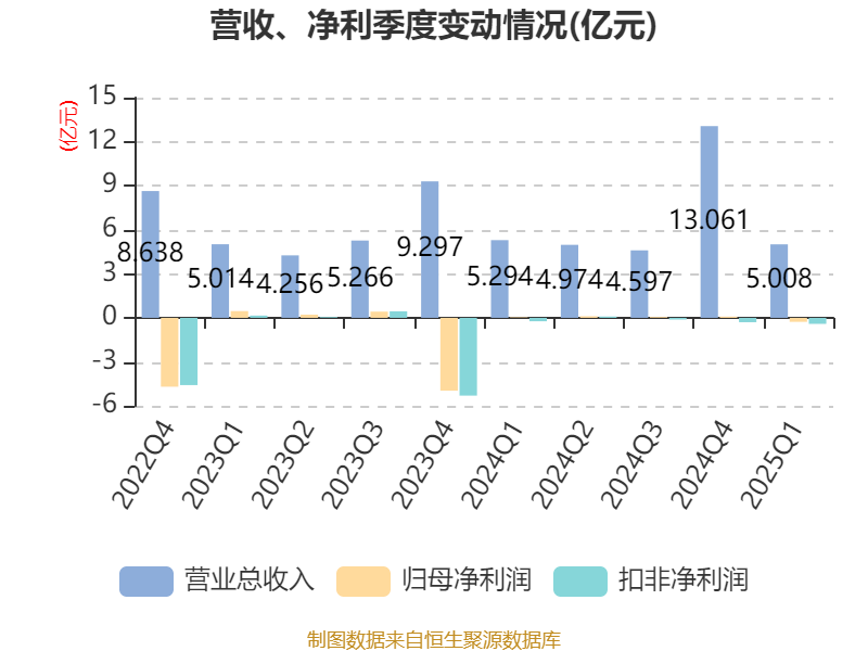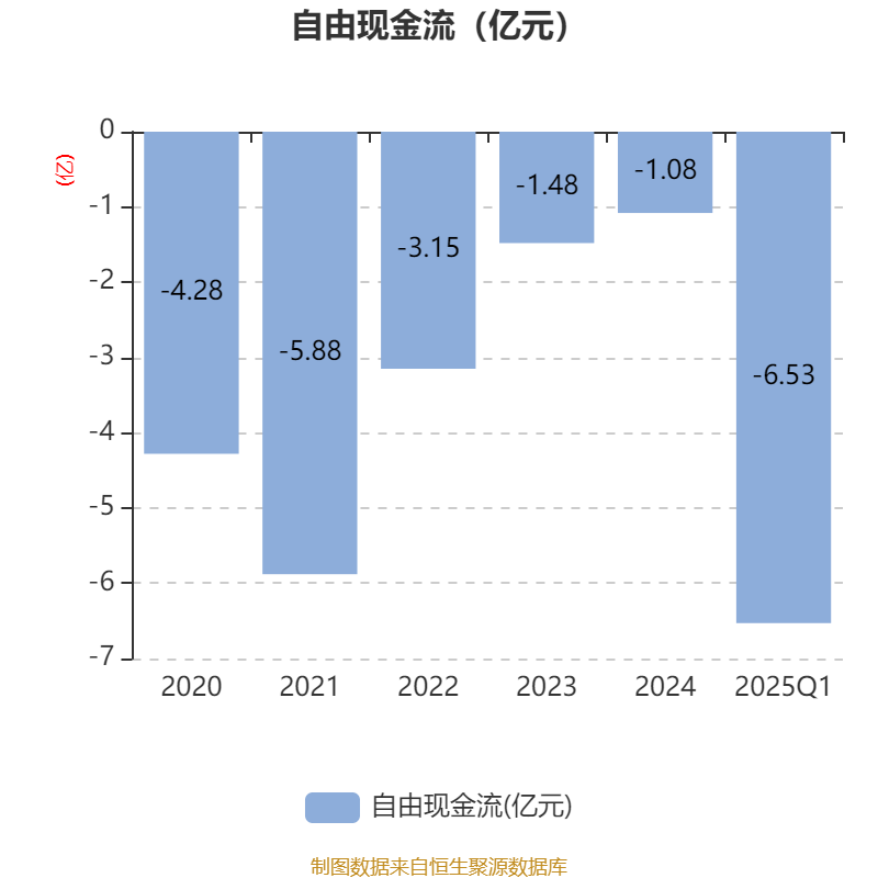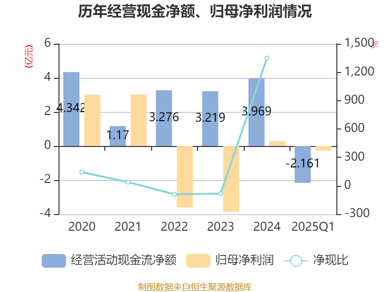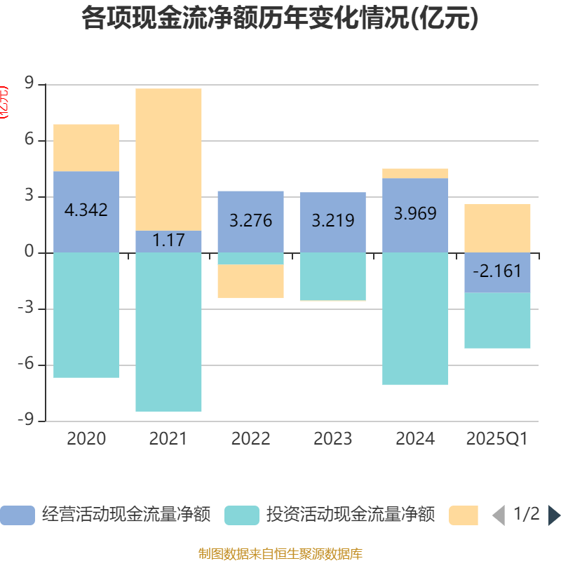 截至2025年一季度末,公司经营活动现金流净额为-2.16亿元,同比增加6771.37万元;筹资活动现金流净额2.59亿元,同比增加3.5亿元;投资活动现金流净额-2.97亿元,上年同期为-6238.34万元。