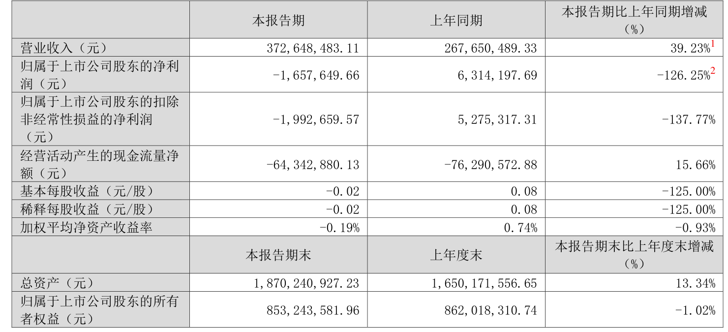 中证智能财讯三羊马(001317)4月28日披露2025年第一季度报告。公司实现营业总收入3.73亿元,同比增长39.23%;归母净利润亏损165.76万元,上年同期盈利631.42万元;扣非净利润亏损199.27万元,上年同期盈利527.53万元;经营活动产生的现金流量净额为-6434.29万元,上年同期为-7629.06万元;报告期内,三羊马基本每股收益为-0.02元,加权平均净资产收益率为-0.19%。