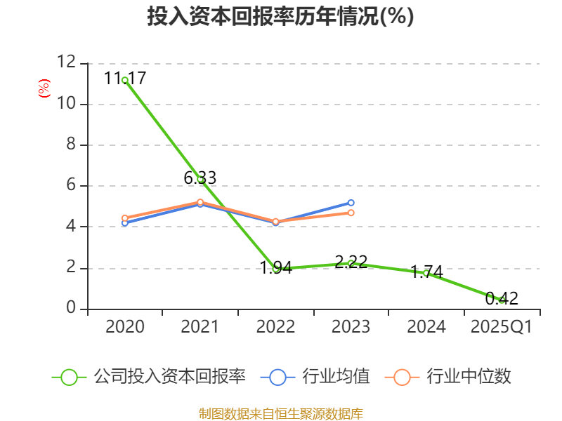 盈利能力方面, 2025年一季度公司加权平均净资产收益率为-0.19%,同比下降0.93个百分点。公司2025年第一季度投入资本回报率为0.42%,较上年同期下降0.35个百分点。