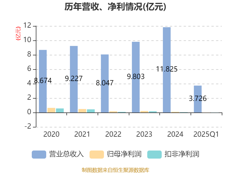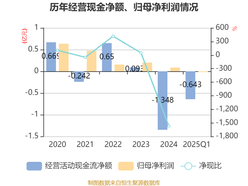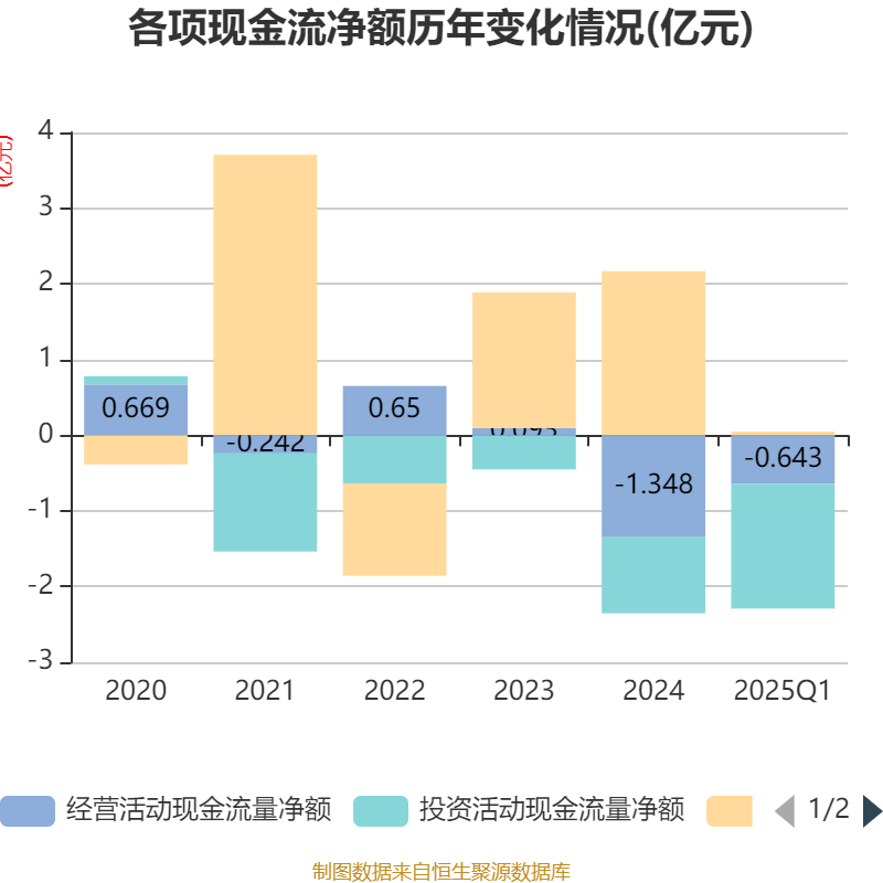 截至2025年一季度末,公司经营活动现金流净额为-6434.29万元,同比增加1194.77万元;筹资活动现金流净额471.9万元,同比减少8932.81万元;投资活动现金流净额-1.65亿元,上年同期为-2.98亿元。