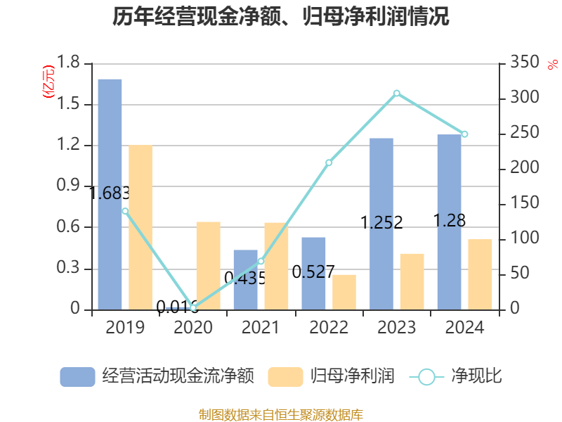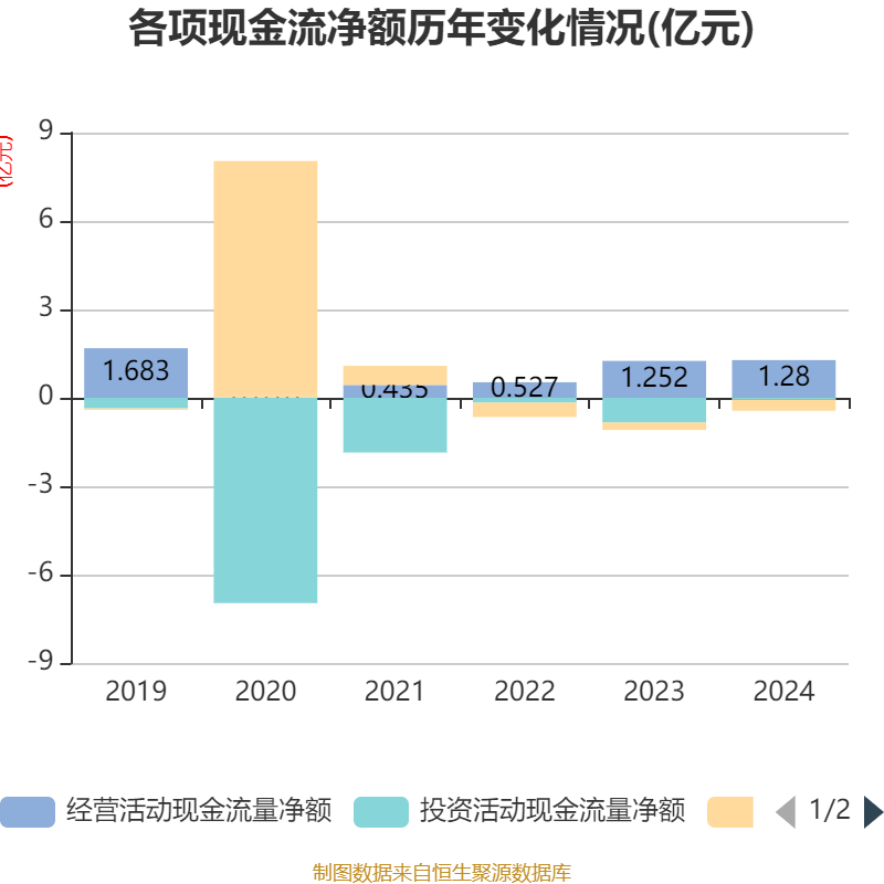 截至2024年,公司经营活动现金流净额为1.28亿元,同比增长2.24%;筹资活动现金流净额-3872.63万元,同比减少1368.48万元;投资活动现金流净额-510.39万元,上年同期为-8414.11万元。