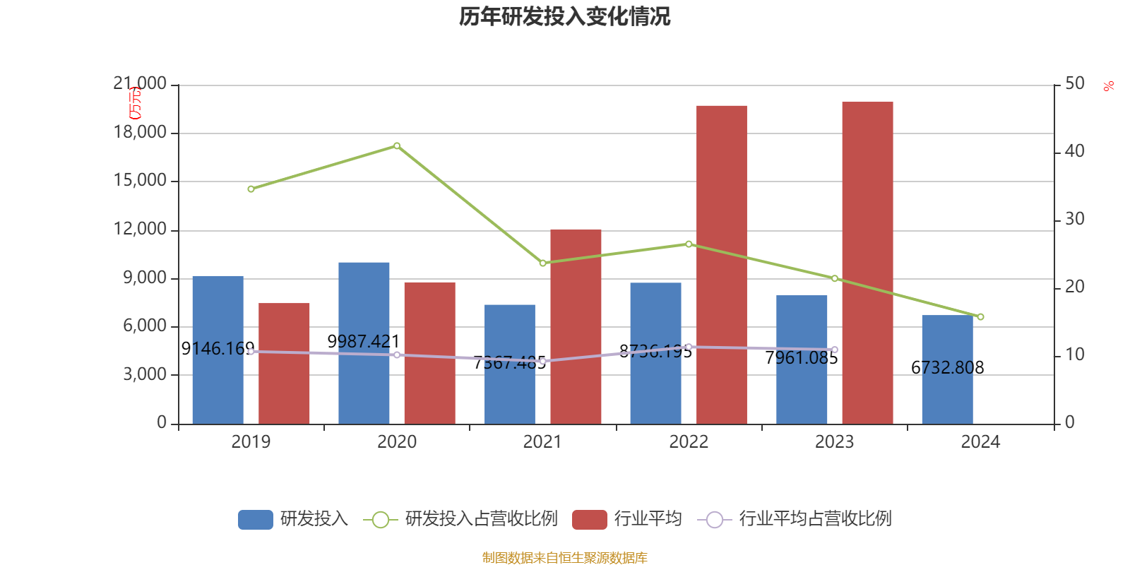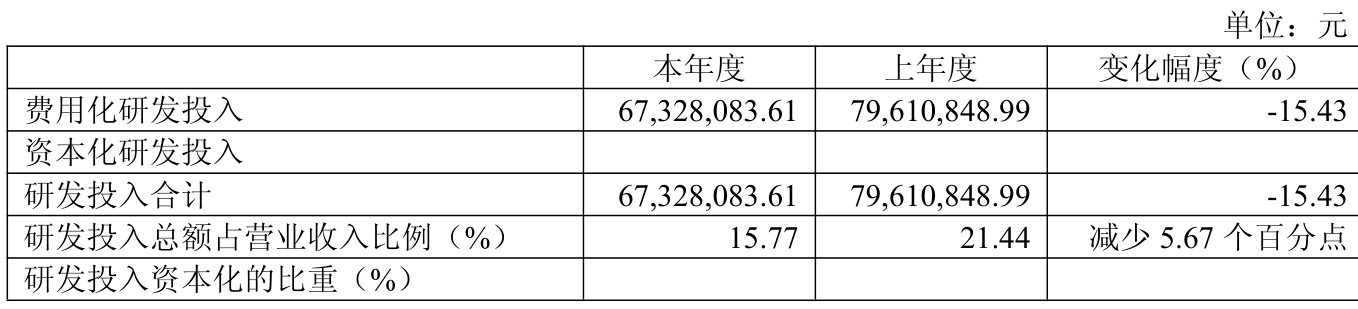 2024年全年,公司研发投入金额为6732.81万元,同比下降15.43%;研发投入占营业收入比例为15.77%,相比上年同期下降5.67个百分点。