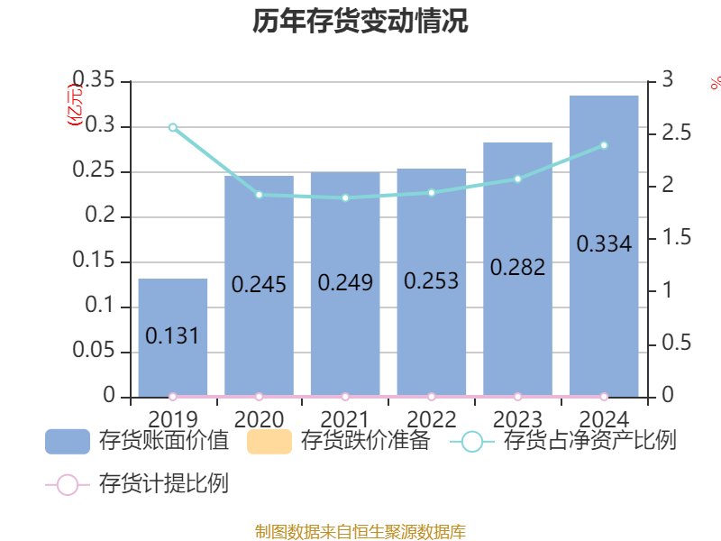 从存货变动来看,截至2024年末,公司存货账面价值为3336.25万元,占净资产的2.39%,较上年末增加518.53万元。公司本期没有计提存货跌价准备。