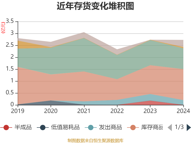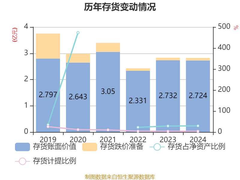 从存货变动来看,截至2024年末,公司存货账面价值为2.72亿元,占净资产的29.33%,较上年末减少84.87万元。其中,存货跌价准备为977.03万元,计提比例为3.46%。