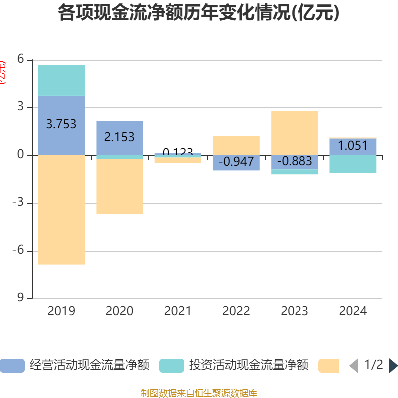 截至2024年,公司经营活动现金流净额为1.05亿元,同比增加1.93亿元;筹资活动现金流净额571.71万元,同比减少2.72亿元;投资活动现金流净额-1.1亿元,上年同期为-3112.05万元。