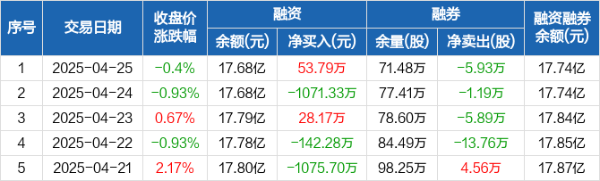 中联重科融资融券信息显示,2025年4月25日融资净买入53.79万元;融资余额17.68亿元,较前一日增加0.03%