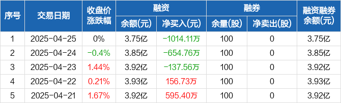 融资方面,当日融资买入1345.42万元,融资偿还2359.53万元,融资净偿还1014.11万元,连续3日净偿还累计1806.43万元。融券方面,融券卖出0股,融券偿还0股,融券余量100股,融券余额984元。融资融券余额合计3.75亿元。