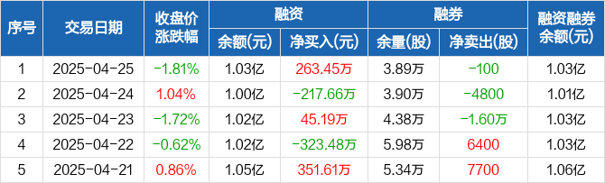 招商积余融资融券信息显示,2025年4月25日融资净买入263.45万元;融资余额1.03亿元,较前一日增加2.63%