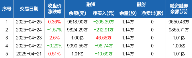 融资方面,当日融资买入210.72万元,融资偿还416.11万元,融资净偿还205.39万元。融券方面,融券卖出0股,融券偿还0股,融券余量1.14万股,融券余额31.53万元。融资融券余额合计9650.43万元。