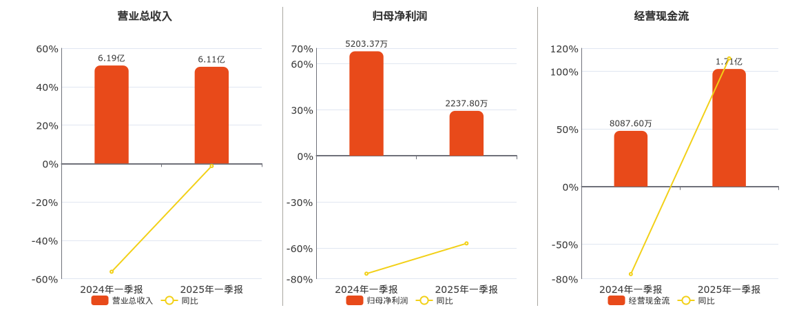 公司营业总收入为6.11亿元,在已披露的同业公司中排名第12,较去年同报告期营业总收入减少813.25万元,同比较去年同期下降1.31%。归母净利润为2237.80万元,在已披露的同业公司中排名第45,较去年同报告期归母净利润减少2965.57万元,同比较去年同期下降56.99%。经营活动现金净流入为1.71亿元,在已披露的同业公司中排名第2,较去年同报告期经营活动现金净流入增加8990.23万元,同比较去年同期上涨111.16%。