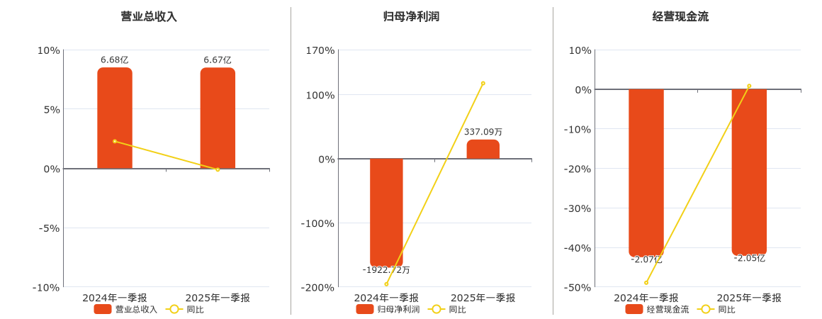 公司营业总收入为6.67亿元,较去年同报告期营业总收入减少82.02万元,同比较去年同期下降0.12%。归母净利润为337.09万元。经营活动现金净流入为-2.05亿元,在已披露的同业公司中排名第61。