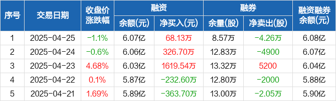 融资方面,当日融资买入1180.61万元,融资偿还1112.47万元,融资净买入68.13万元,连续3日净买入累计2014.38万元。融券方面,融券卖出0股,融券偿还4.26万股,融券余量8.57万股,融券余额84.76万元。融资融券余额合计6.08亿元。