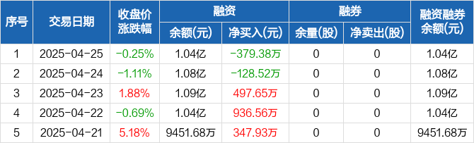 融资方面,当日融资买入344.44万元,融资偿还723.82万元,融资净偿还379.38万元。融券方面,融券卖出0股,融券偿还0股,融券余量0股,融券余额0元。融资融券余额合计1.04亿元。