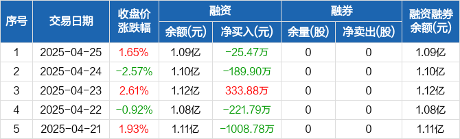 融资方面,当日融资买入737.36万元,融资偿还762.83万元,融资净偿还25.47万元。融券方面,融券卖出0股,融券偿还0股,融券余量0股,融券余额0元。融资融券余额合计1.09亿元。