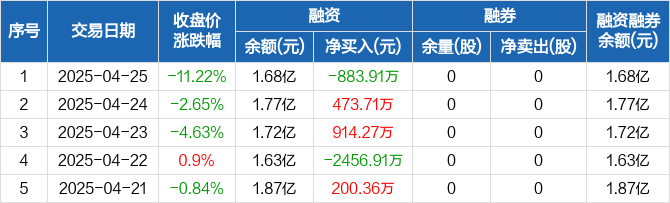 融资方面,当日融资买入2444.51万元,融资偿还3328.42万元,融资净偿还883.91万元。融券方面,融券卖出0股,融券偿还0股,融券余量0股,融券余额0元。融资融券余额合计1.68亿元。