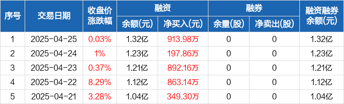 融资方面,当日融资买入2383.01万元,融资偿还1469.03万元,融资净买入913.98万元,连续7日净买入累计3768.35万元。融券方面,融券卖出0股,融券偿还0股,融券余量0股,融券余额0元。融资融券余额合计1.32亿元。