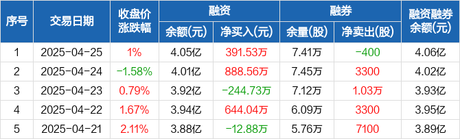 融资方面,当日融资买入4351.89万元,融资偿还3960.36万元,融资净买入391.53万元。融券方面,融券卖出0股,融券偿还400股,融券余量7.41万股,融券余额149.53万元。融资融券余额合计4.06亿元。