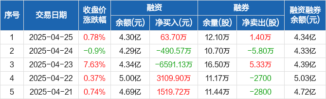 融资方面,当日融资买入1452.24万元,融资偿还1388.54万元,融资净买入63.7万元。融券方面,融券卖出1.77万股,融券偿还3700股,融券余量12.1万股,融券余额390.21万元。融资融券余额合计4.34亿元。