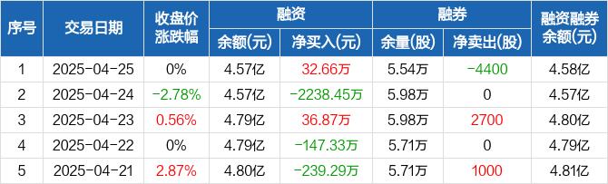 融资方面,当日融资买入1359.48万元,融资偿还1326.82万元,融资净买入32.66万元。融券方面,融券卖出0股,融券偿还4400股,融券余量5.54万股,融券余额19.39万元。融资融券余额合计4.58亿元。