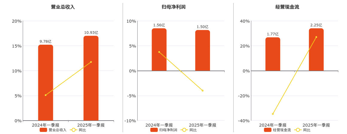 公司营业总收入为10.93亿元。归母净利润为1.50亿元,较去年同报告期归母净利润减少624.41万元,同比较去年同期下降4.00%。经营活动现金净流入为2.25亿元。