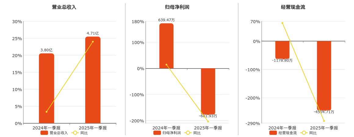 公司营业总收入为4.71亿元,在已披露的同业公司中排名第42。归母净利润为-661.93万元,在已披露的同业公司中排名第73,较去年同报告期归母净利润减少1301.40万元,同比较去年同期下降203.51%。经营活动现金净流入为-4504.71万元,较去年同报告期经营活动现金净流入减少3325.91万元。