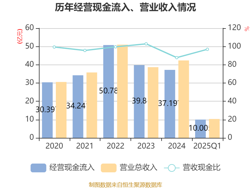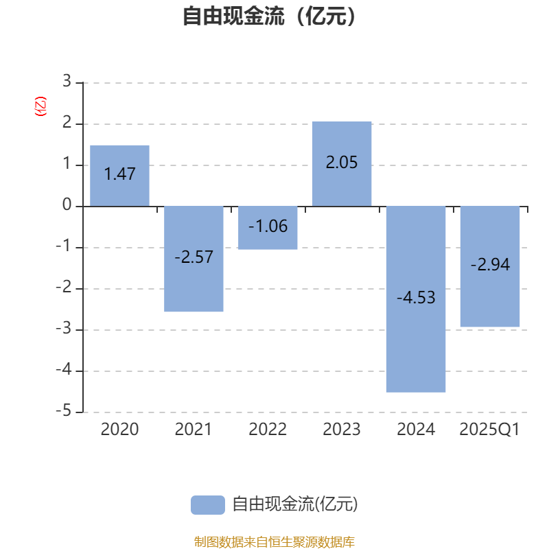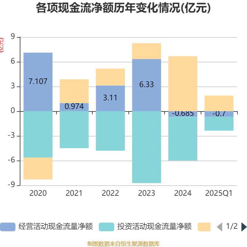 截至2025年一季度末,公司经营活动现金流净额为-6999.69万元,同比减少100.45万元;筹资活动现金流净额1.89亿元,同比增加5969.97万元;投资活动现金流净额-1.67亿元,上年同期为-1.7亿元。