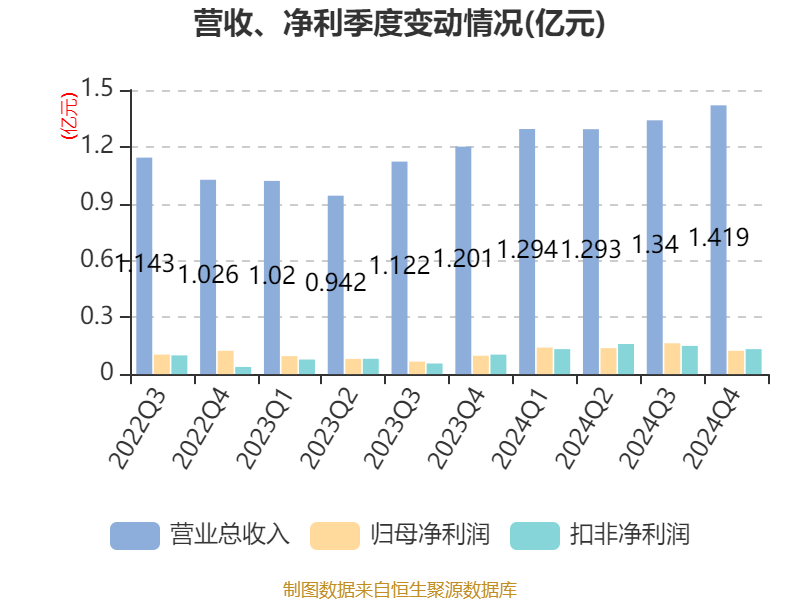 中证智能财讯联合化学(301209)4月28日披露2024年年度报告。2024年,公司实现营业总收入5.35亿元,同比增长24.80%;归母净利润5643.21万元,同比增长66.81%;扣非净利润5725.74万元,同比增长80.94%;经营活动产生的现金流量净额为4185.58万元,同比下降39.94%;报告期内,联合化学基本每股收益为0.7054元,加权平均净资产收益率为7.94%。公司2024年度分配预案为:拟向全体股东每10股转4股,派现2元(含税)。