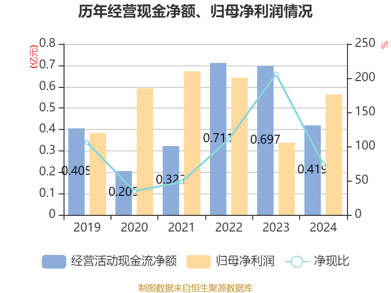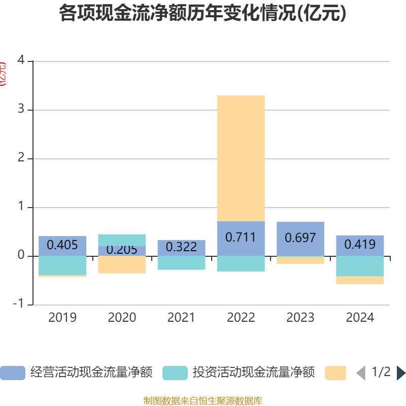 截至2024年,公司经营活动现金流净额为4185.58万元,同比下降39.94%;筹资活动现金流净额-1600万元,同比减少149.6万元;投资活动现金流净额-4240.88万元,上年同期为-217.42万元。