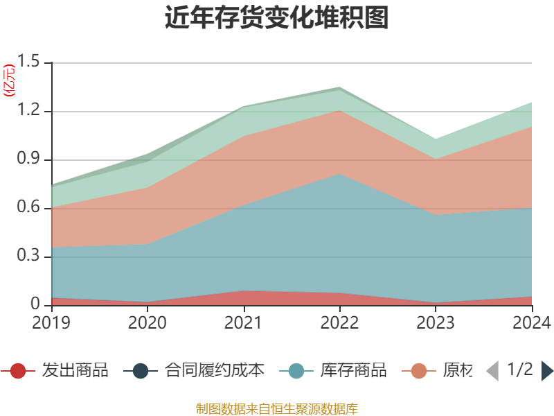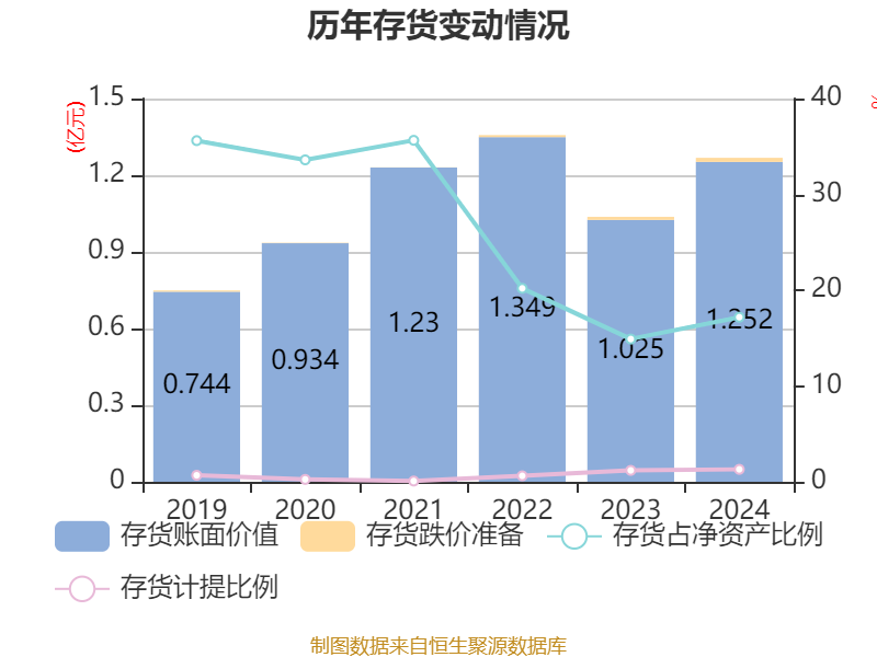 从存货变动来看,截至2024年末,公司存货账面价值为1.25亿元,占净资产的17.18%,较上年末增加2268.62万元。其中,存货跌价准备为164.3万元,计提比例为1.3%。