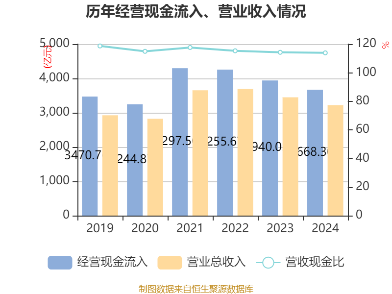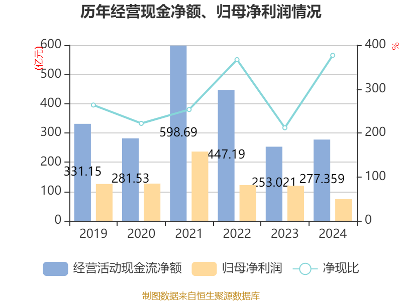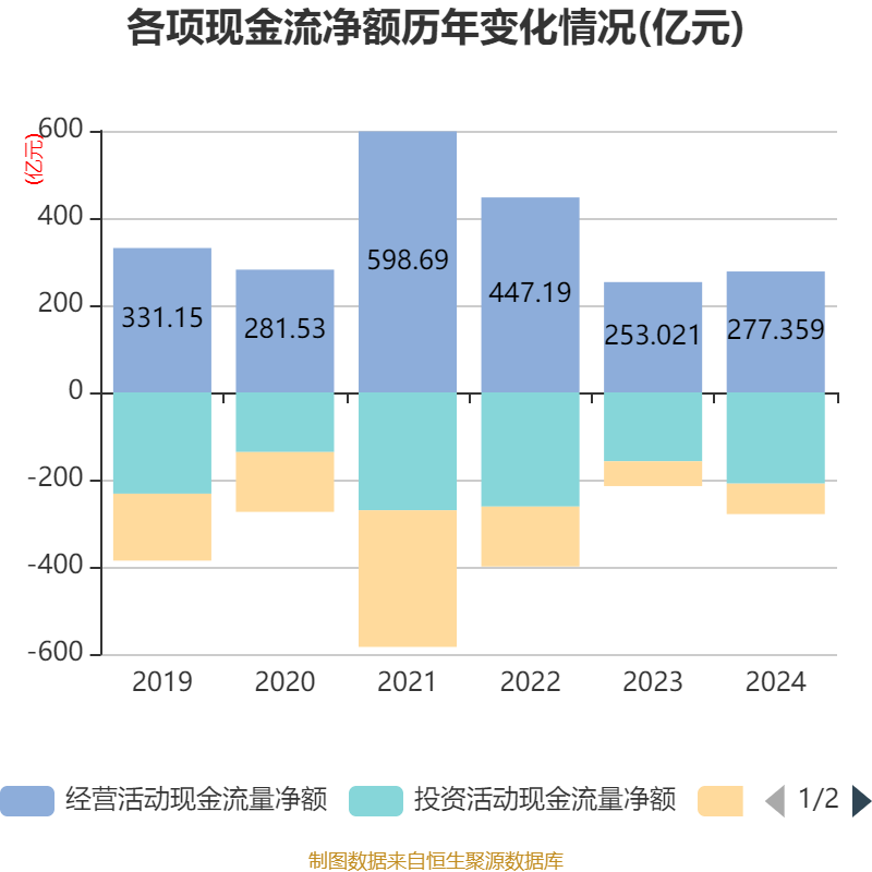截至2024年,公司经营活动现金流净额为277.36亿元,同比增长9.62%;筹资活动现金流净额-69.91亿元,同比减少13.1亿元;投资活动现金流净额-209.21亿元,上年同期为-158.06亿元。