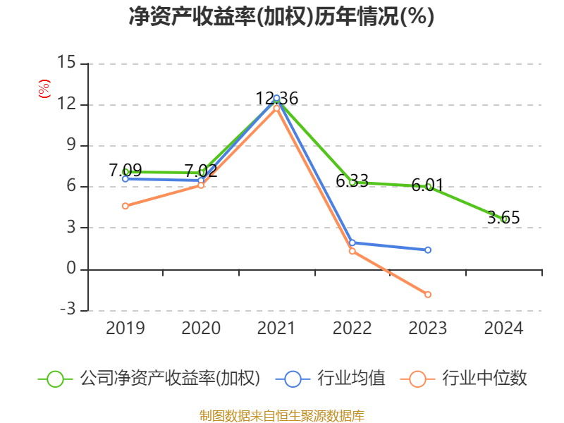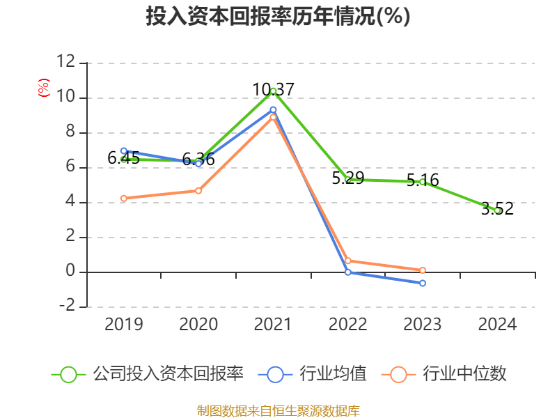 数据显示,2024年公司加权平均净资产收益率为3.65%,较上年同期下降2.36个百分点。公司2024年投入资本回报率为3.52%,较上年同期下降1.64个百分点。
