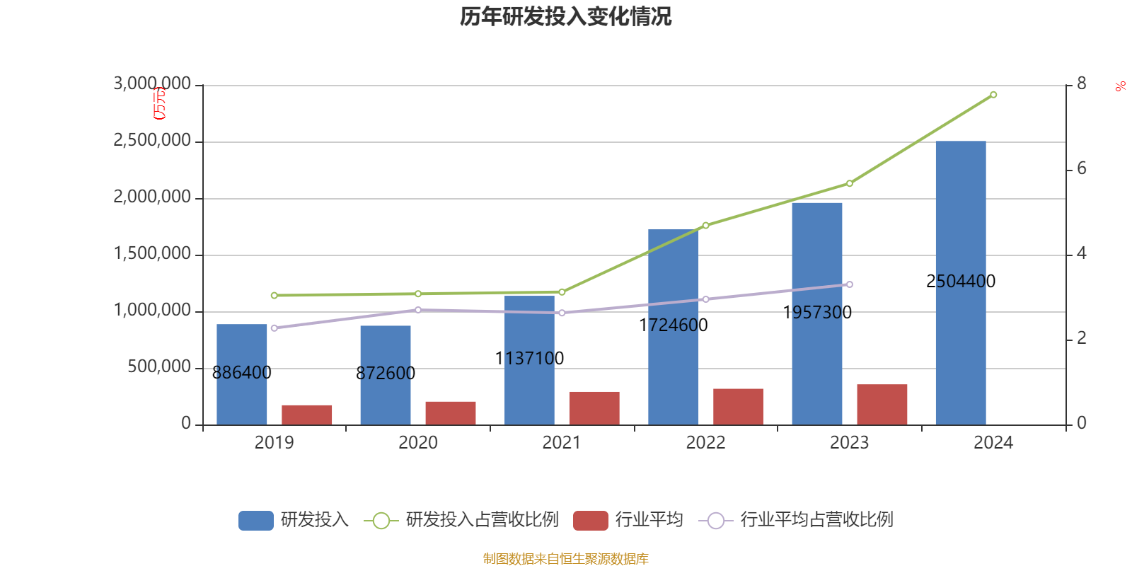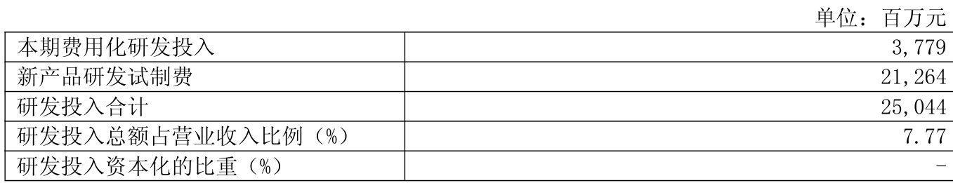 2024年全年,公司研发投入金额为250.44亿元,同比增长27.95%;研发投入占营业收入比例为7.77%,相比上年同期上升2.09个百分点。此外,公司全年研发投入资本化率为84.91%。